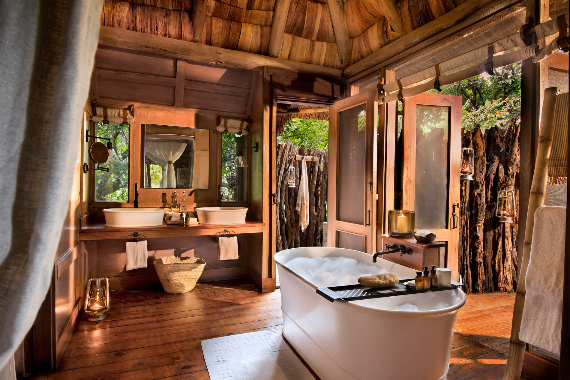 Die 10 Baumhaussuiten wurden aus lokal vorkommenden Hölzern und Makuti- Palmwedeln gebaut und vereinen gediegene Eleganz mit Romantik. So ist für ein exklusives Ambiente in einer kühlen, lauschigen Umgebung gesorgt. Jede Baumhaussuite hat eine eigene, großzügig angelegte Terrasse und große Fenster mit Blick in die grünen Baumwipfel. Die klassischen, eleganten Zimmer mit zeitgemäßem Mobiliar in erdigen Tönen und Texturen sind auch mit Ventilatoren und Moskitonetzen ausgestattet. Die Badezimmer haben eine freistehende Badewanne mit Blick in den Wald sowie eine Dusche unter freiem Himmel.