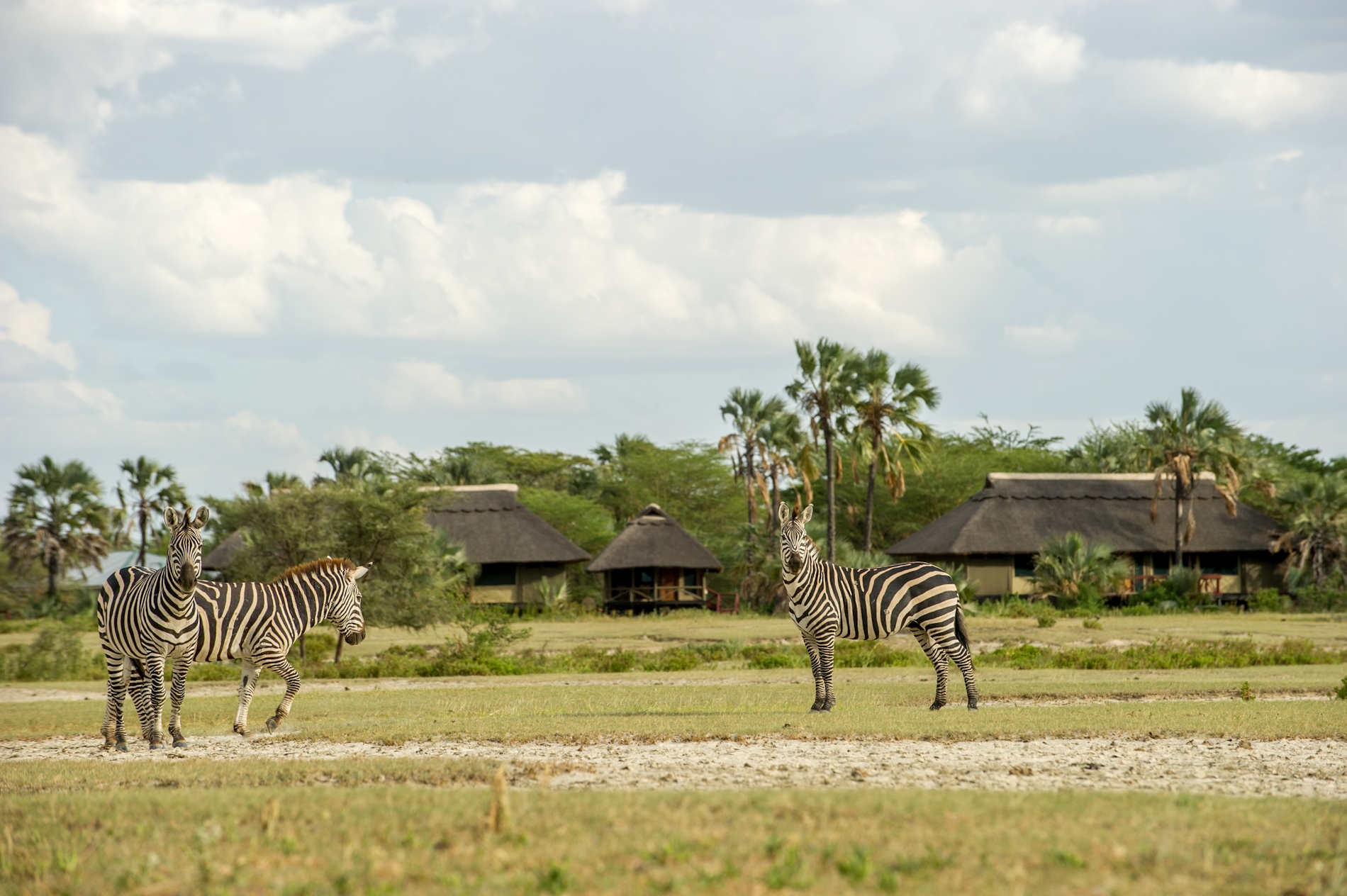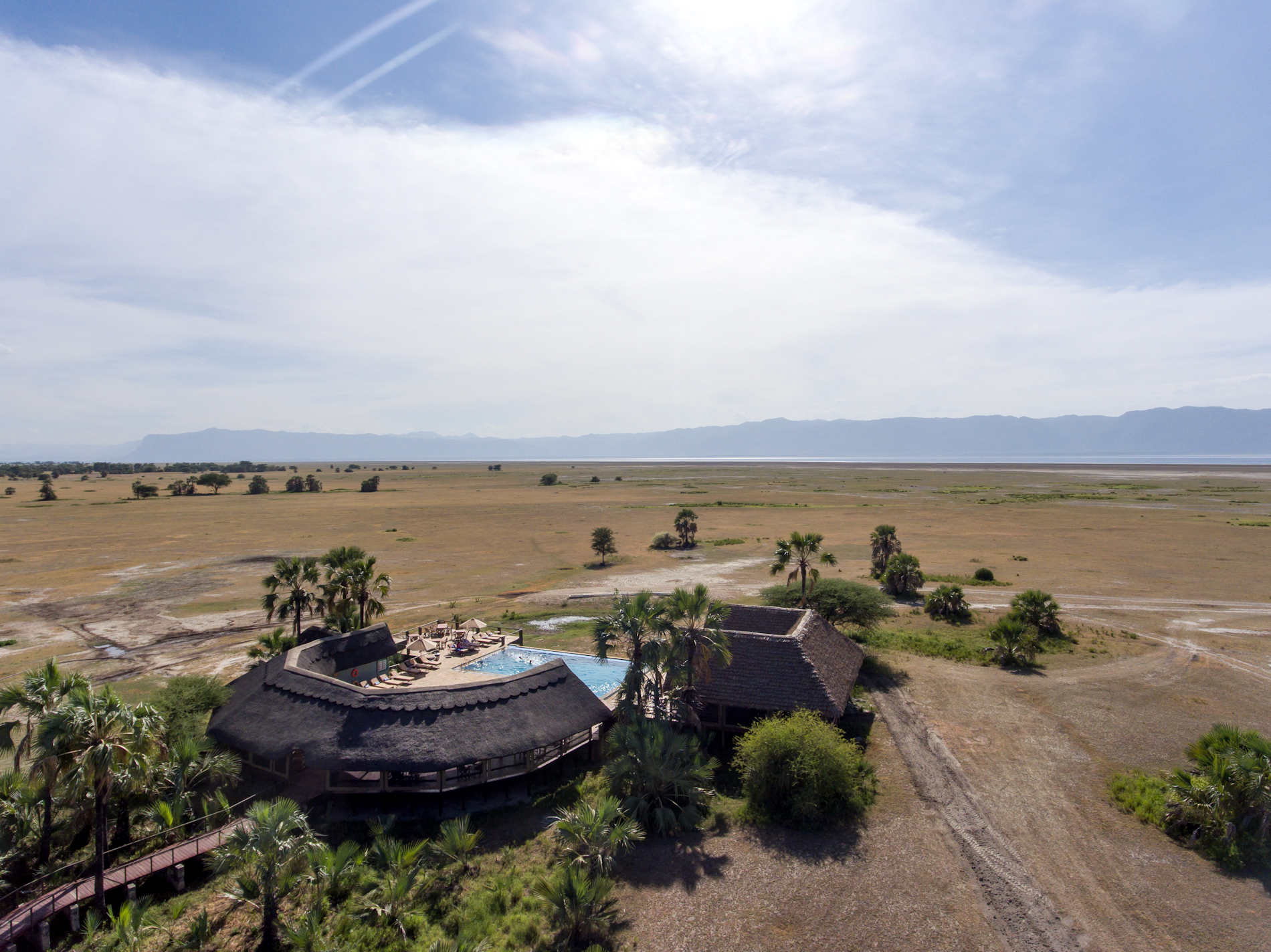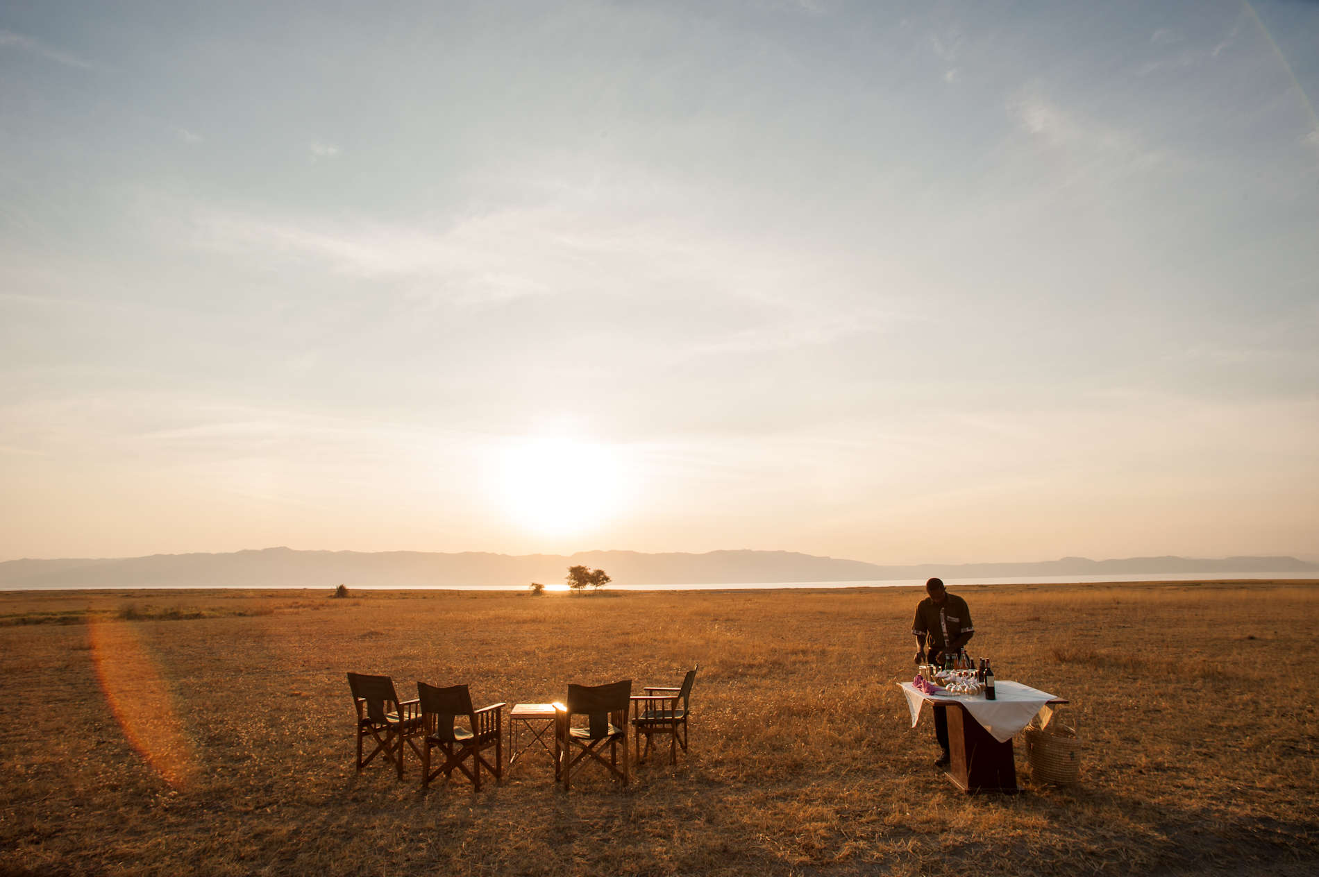 Zum Maramboi Tented Camp gehören ein Restaurant in dem Sie die Mahlzeiten auch unter freiem Himmel zu sich nehmen können und eine erhöhte Holzplattform mit Strohdach, umgeben von Palmen und mit Blick auf das Ufer des Lake Manyara und den Busch.