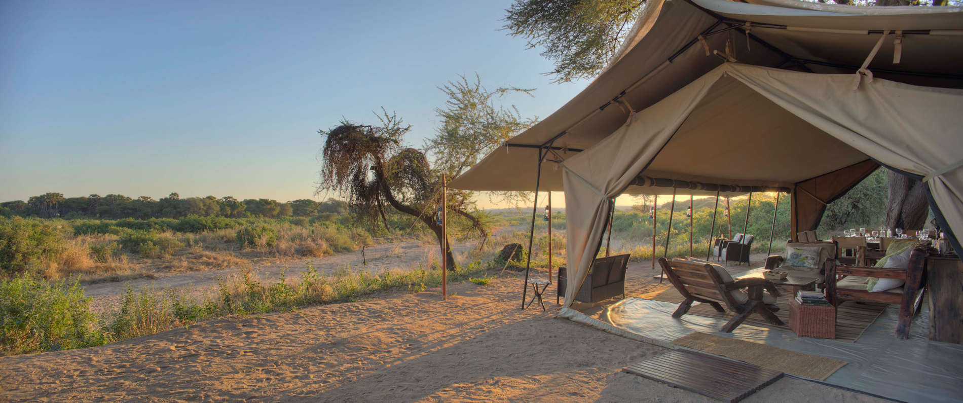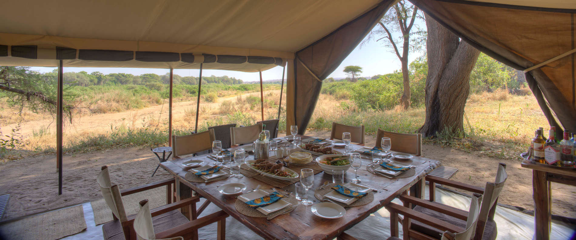 Die 3 Zelte des Basiscamps liegen mitten in der unberührten Landschaft des Ruaha Nationalparks unter Schatten spendenden Bäumen.