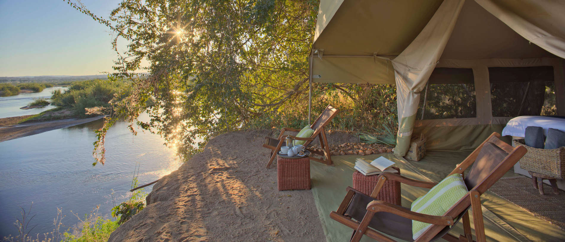 Die Zelte des Basiscamps sind funktional mit Eimerdusche und Buschtoilette ausgestattet und werden saisonal an dem Ort im Nationalpark aufgebaut, den Moli und Noelle als nächstes näher erkunden möchten. Das Zentrum des Camps bildet ein zu allen Seiten hin geöffnetes Hauptzelt, in dem am Abend zusammen gegessen wird und wo Sie sich in komfortablen Stühlen niederlassen und entspannen können.