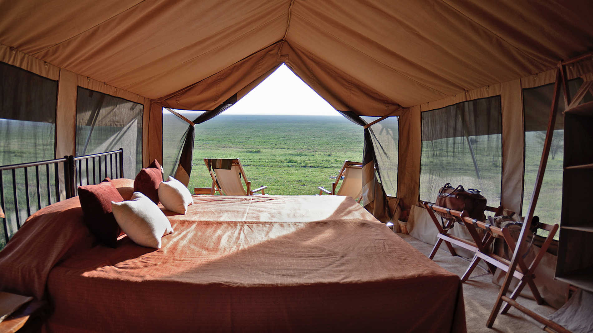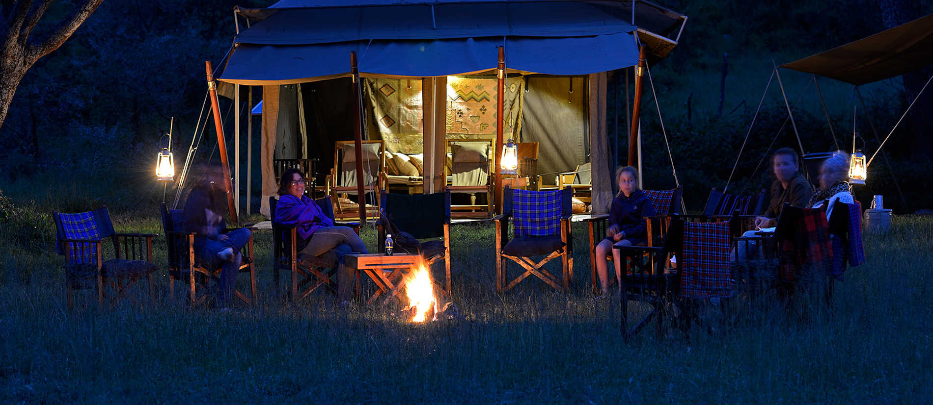 Das Camp besteht aus grossen Schlafzelten mit Bad, ausgerüstet mit breiten, gemütlichen Betten, weichen Laken und warmen Decken. Das geräumige Essenszelt bietet eine gut ausgestattete Bar, und