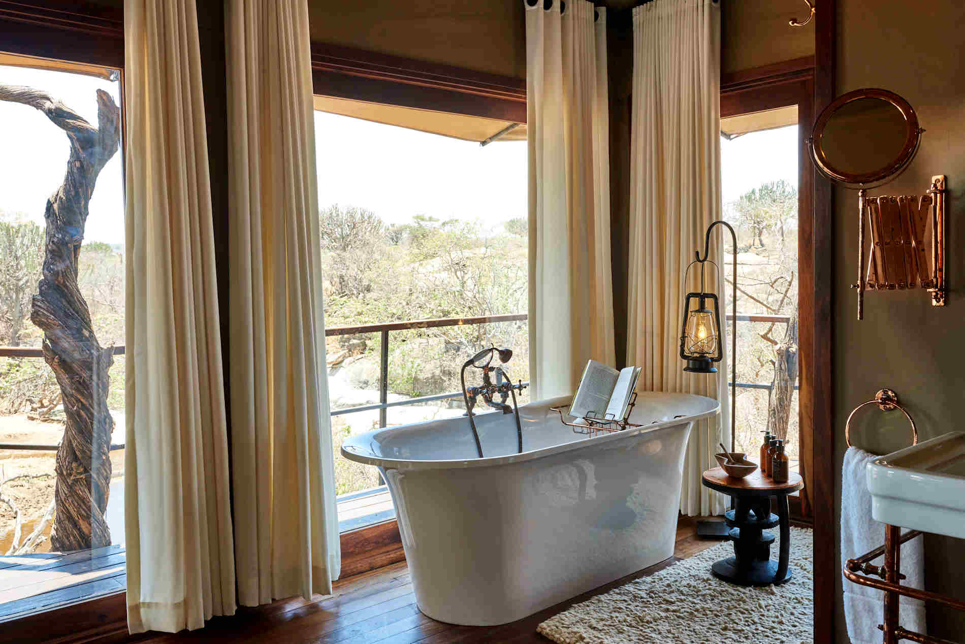 Die luxuriöse Mwiba Lodge liegt eingebettet zwischen eindrucksvollen Felsen und Bäumen und blickt in großer Höhe auf eine felsige Schlucht und den Arugusinyai Fluss.