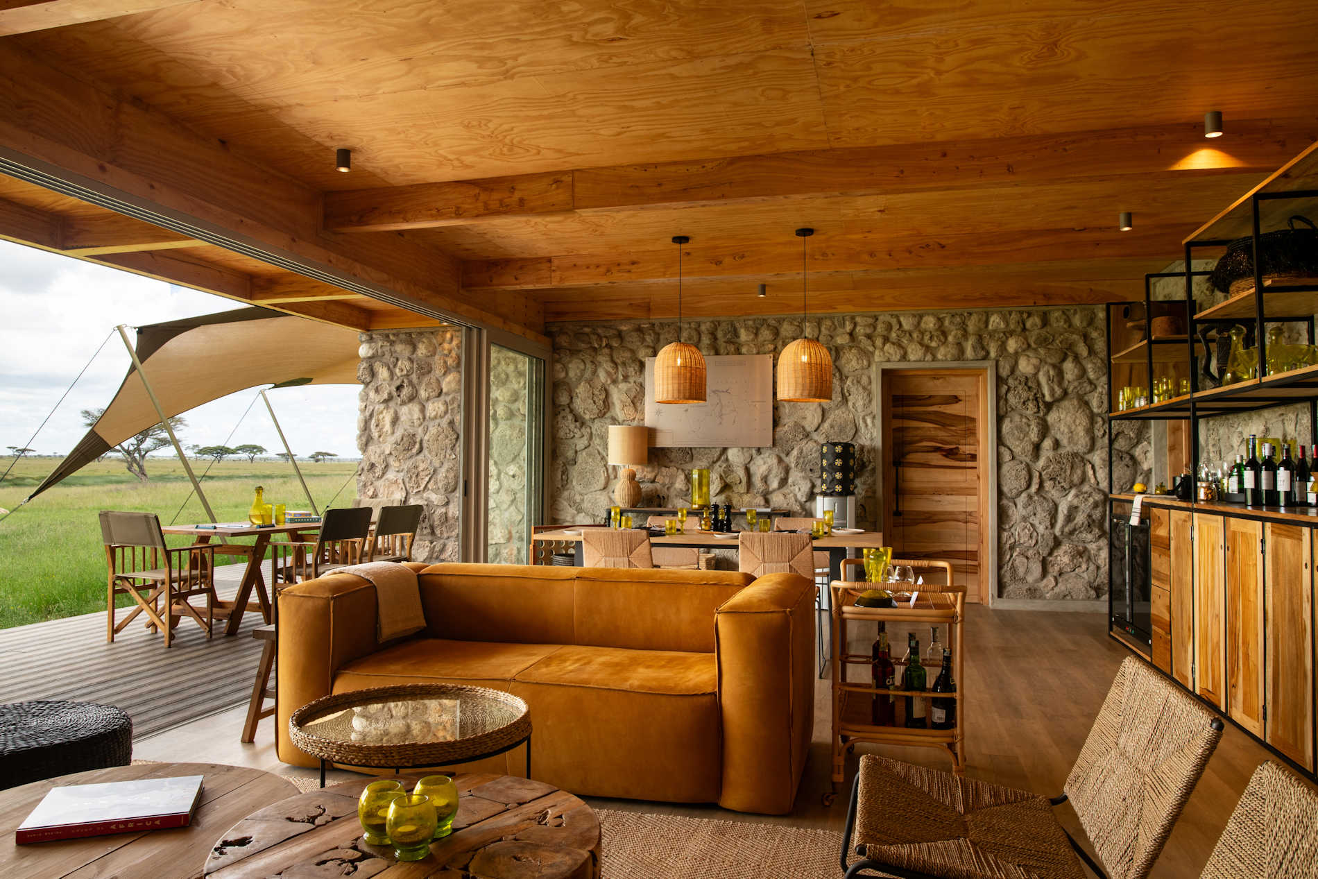Die Verwendung von Steinmauern aus Calcrete zieht sich wie ein roter Faden durch die Namiri Plains Retreat. Calcrete ist ein kalkhaltiges Nebenprodukt von Vulkanausbrüchen, die vor Millionen von Jahren stattfanden und in der südlichen und östlichen Serengeti zu finden sind. Die Steinwände absorbieren die Mittagshitze, halten die Räume tagsüber kühl und speichern die Wärme in der Nacht, während sie das Design mit der umgebenden Landschaft verbinden.