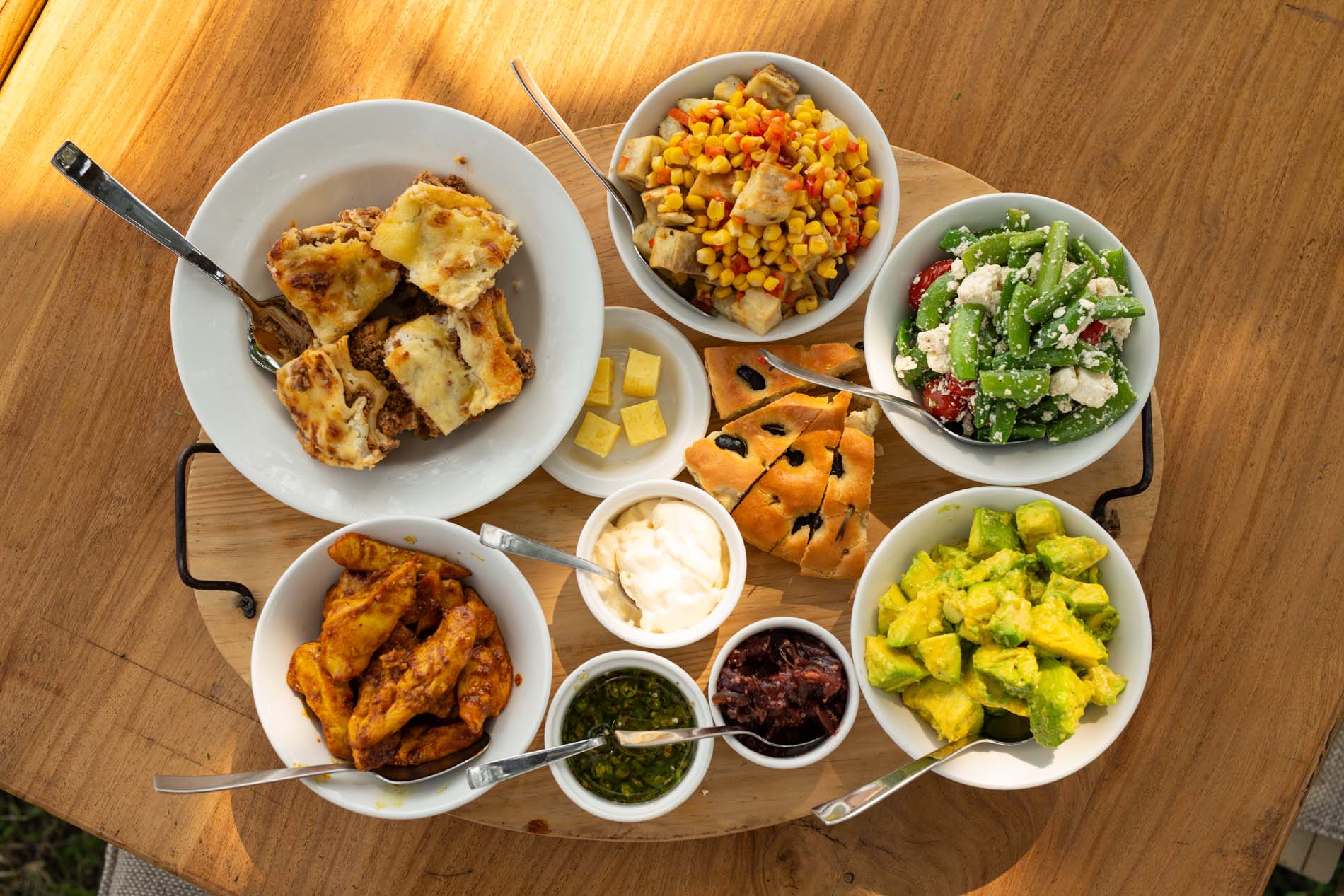 Die Mahlzeiten im Ubuntu werden gemeinsam eingenommen und finden in der Regel im nahe gelegenen Speisezelt oder bei schönem Wetter unter freiem Himmel statt. Bevor es zum Abendessen geht, treffen sich die Gäste in der Regel am Lagerfeuer, um einen wohlverdienten Drink zu genießen und sich über die Erlebnisse des Tages auszutauschen.