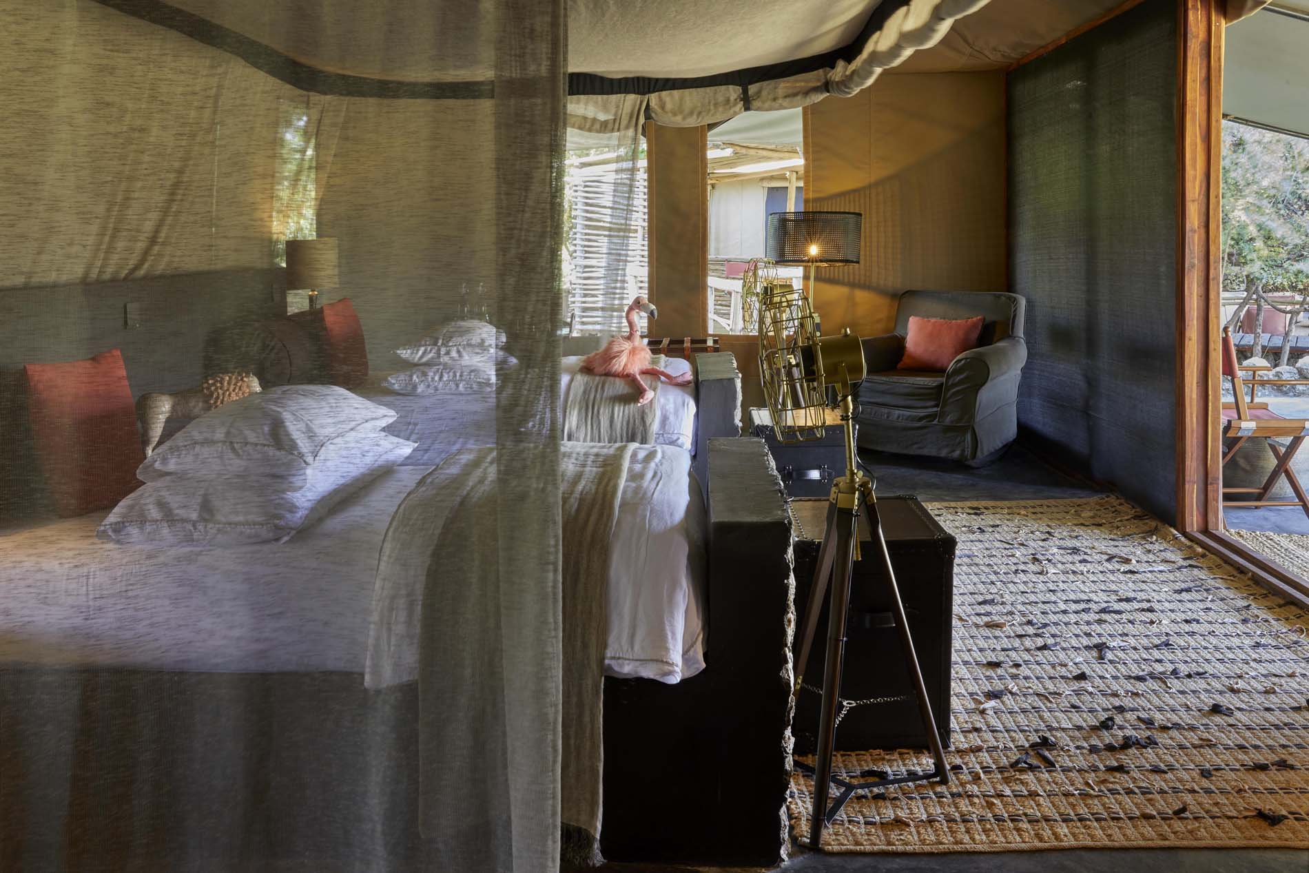 Die nur acht luxuriösen Zelte im Suiten Stil, die wohl überlegt der üppig bewachsene Umgebung angepasst sind, verfügen über ein elegantes Schlafzimmer, ein Lesezimmer, ein voll ausgestattetes Badezimmer, Außendusche und eine mit Holzboden verlegte Sonnenterasse, die dazu einlädt, den Abend im Freien ausklingen zu lassen. Die Zelte sind im zeitgemäßen und dennoch klassischen Stil möbliert, die Dekoration ist ebenso klassisch schick und zeichnet sich durch dunkles Holz, Erdfarben und natürliche Stoffe aus.