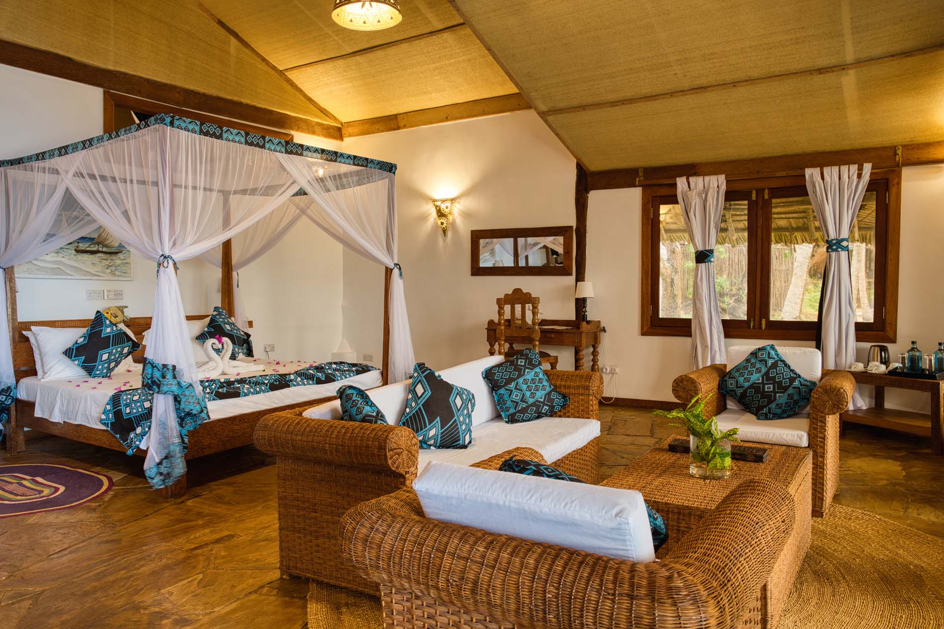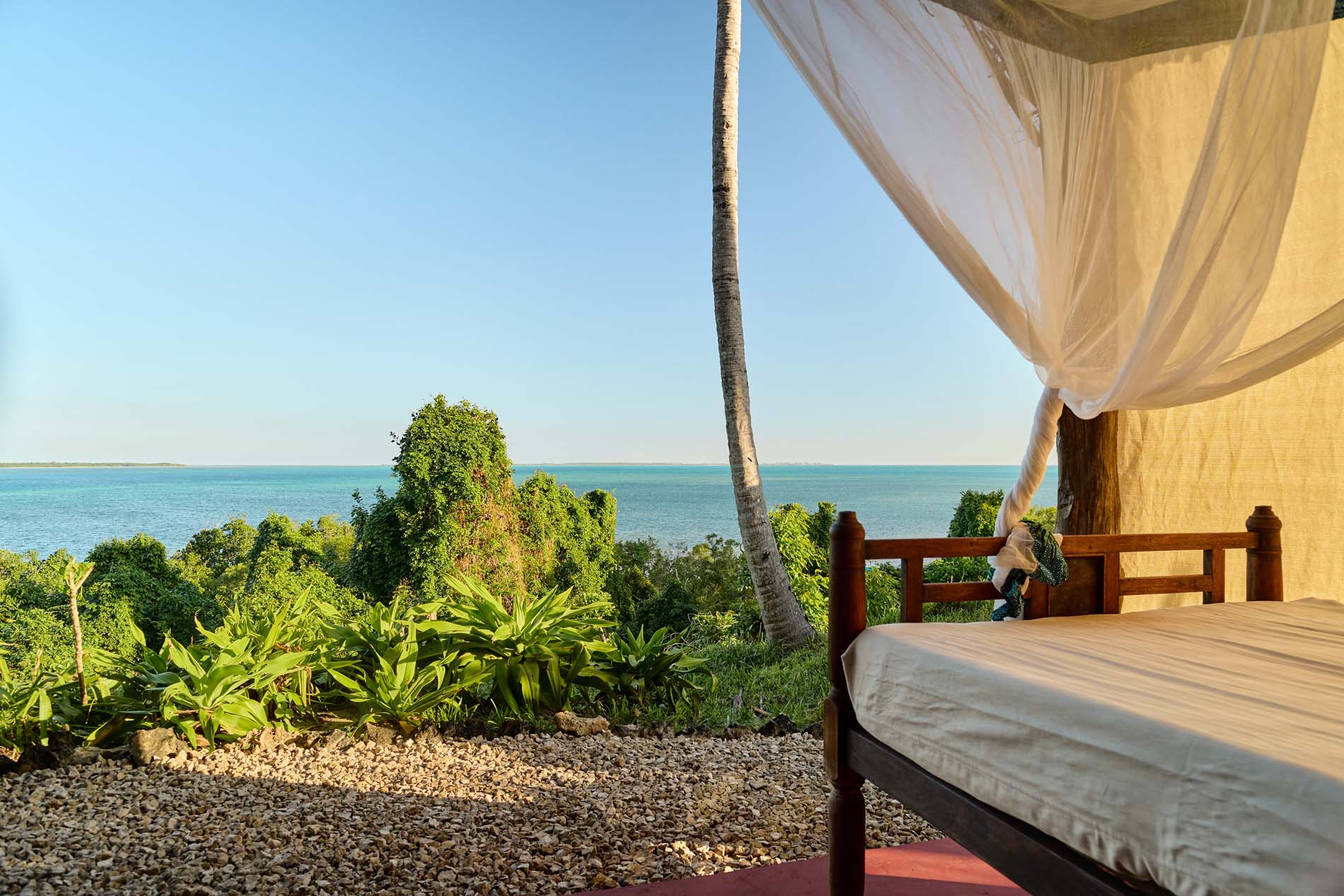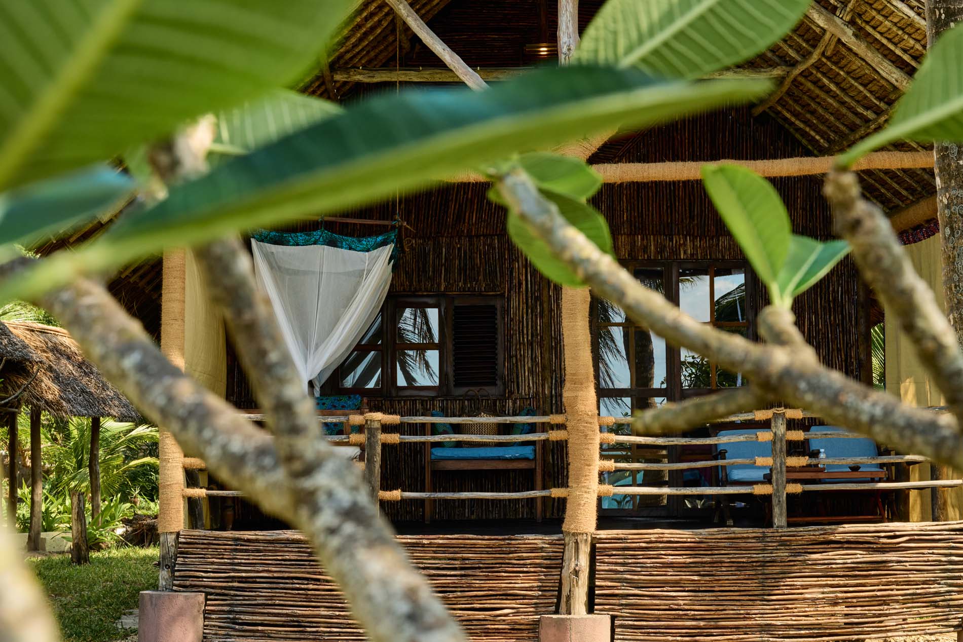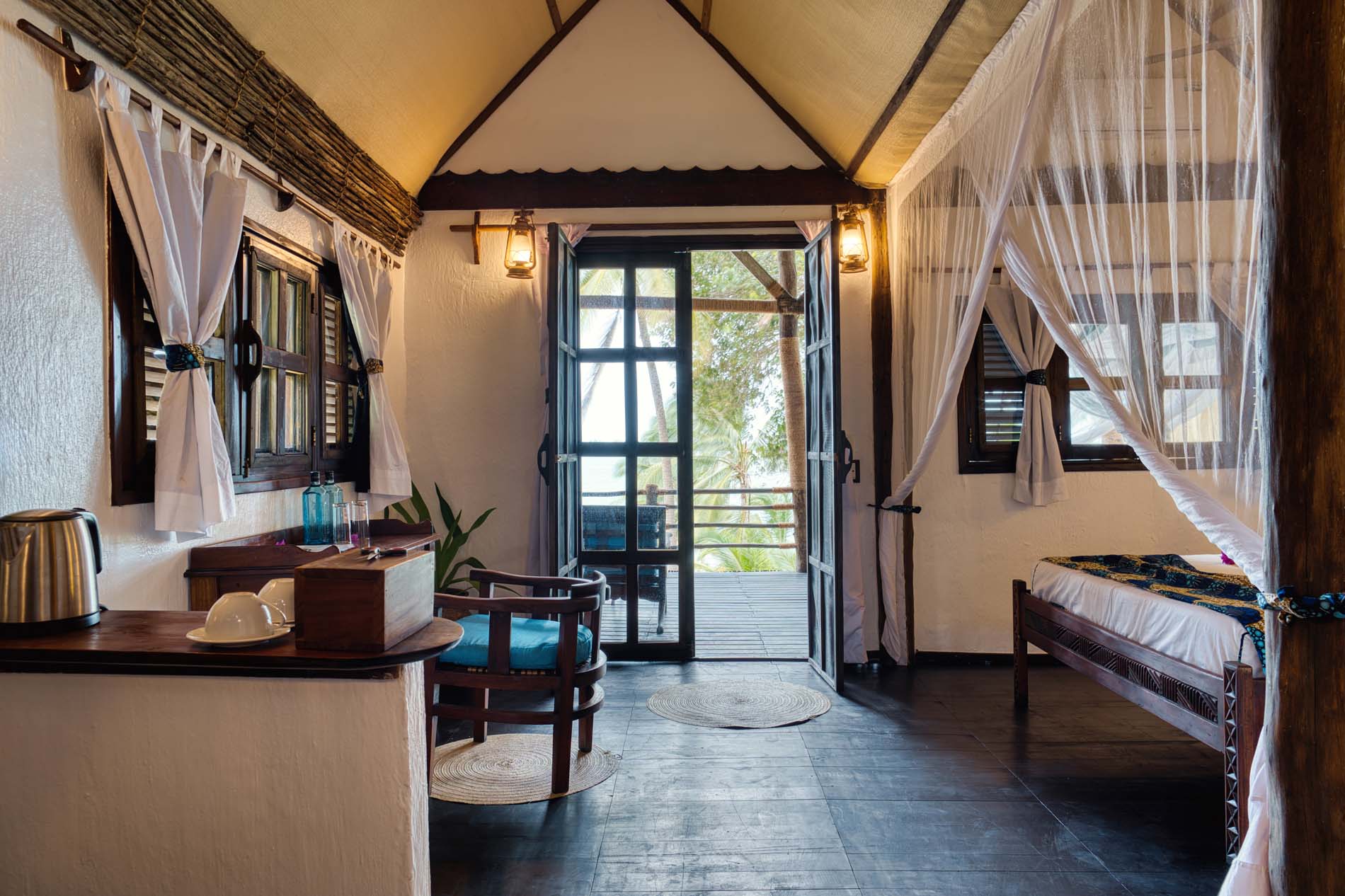 Zwei Bungalows sind Familiensuiten mit zwei Zimmern, die durch ein gemeinsames Badezimmer und einen kleinen Flur voneinander getrennt sind, um Privatsphäre zu gewährleisten. Die großen privaten Veranden sind mit einem Sansibar-Tagesbett, Stühlen und einem Couchtisch ausgestattet. Alle Bungalows sind eigenständig und verfügen über Deckenventilatoren, um sie kühl zu halten.