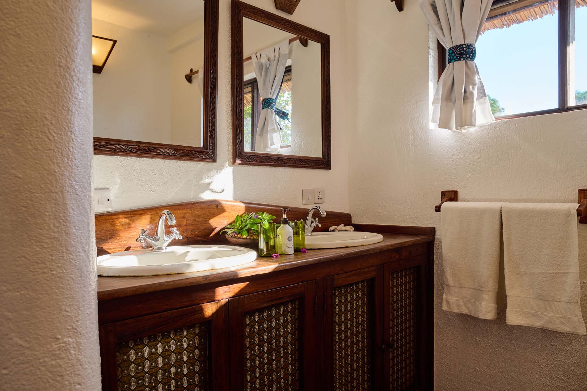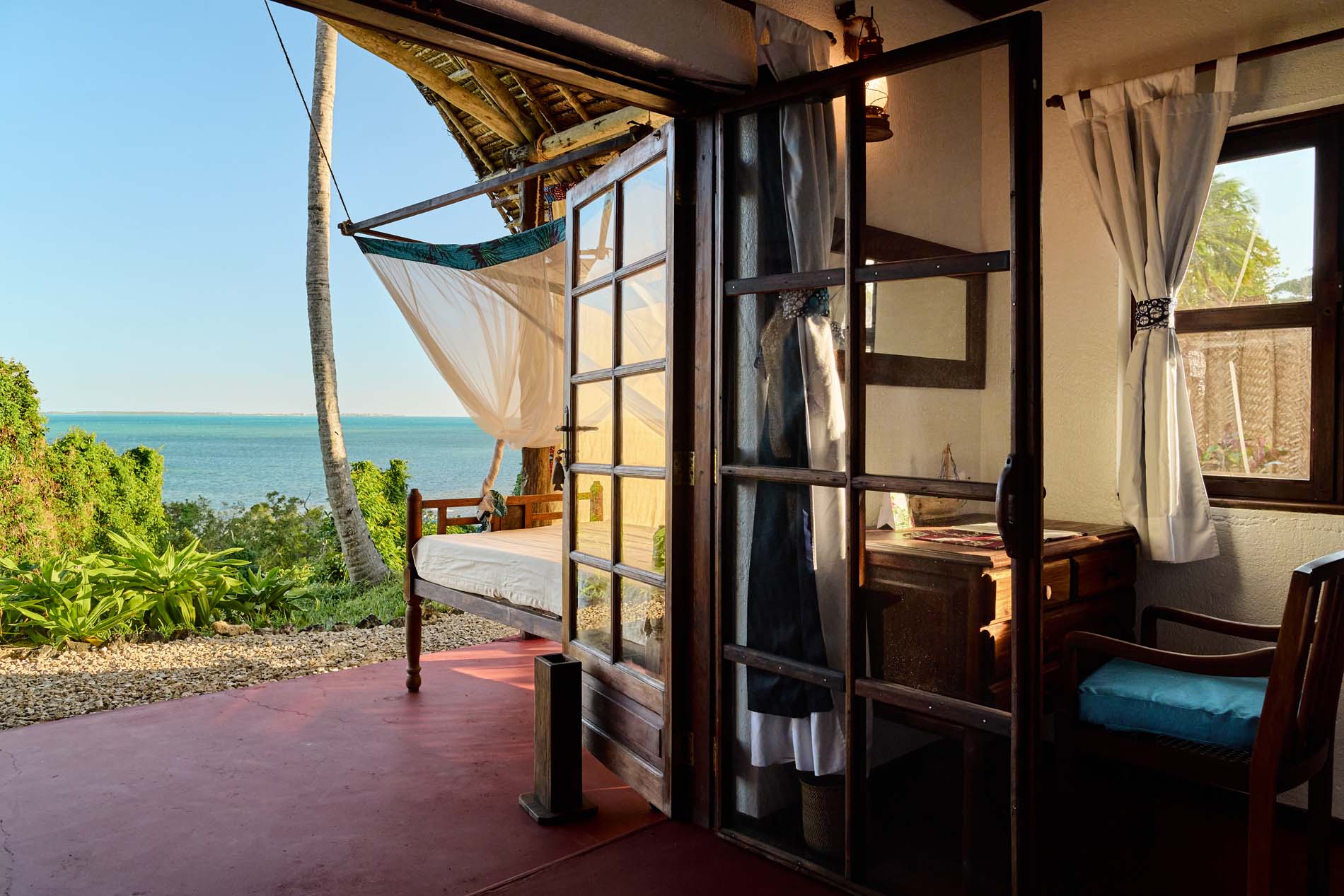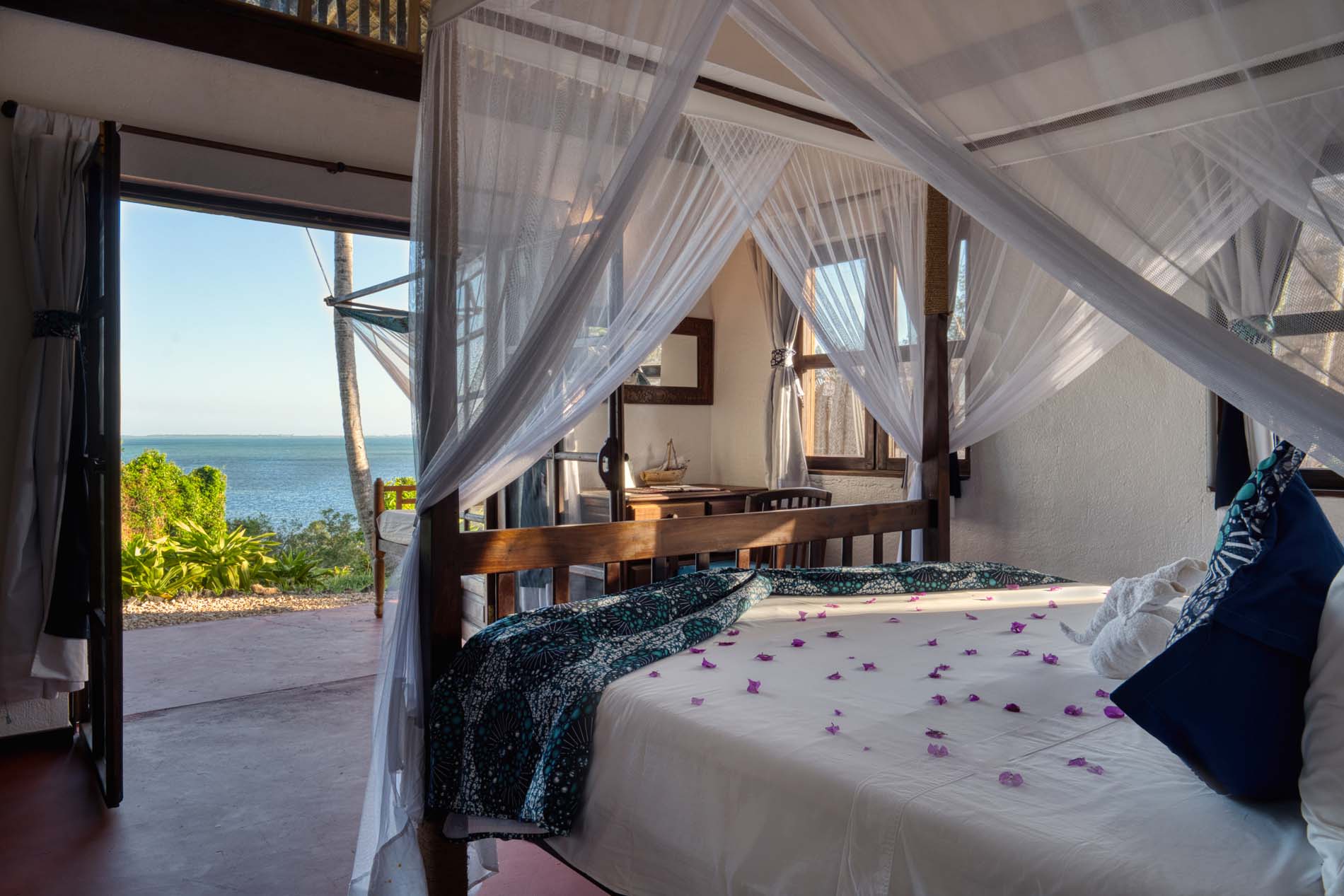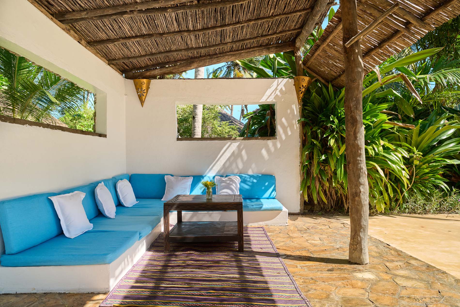 Zwei Bungalows sind Familiensuiten mit zwei Zimmern, die durch ein gemeinsames Badezimmer und einen kleinen Flur voneinander getrennt sind, um Privatsphäre zu gewährleisten. Die großen privaten Veranden sind mit einem Sansibar-Tagesbett, Stühlen und einem Couchtisch ausgestattet. Alle Bungalows sind eigenständig und verfügen über Deckenventilatoren, um sie kühl zu halten.