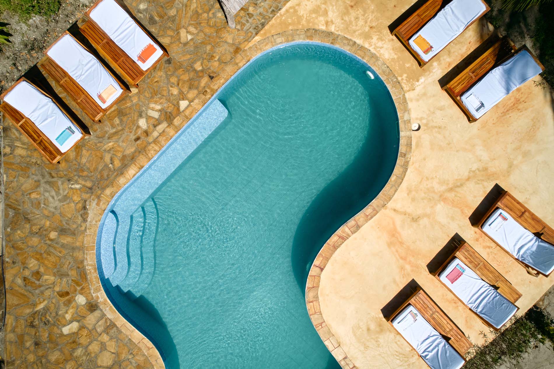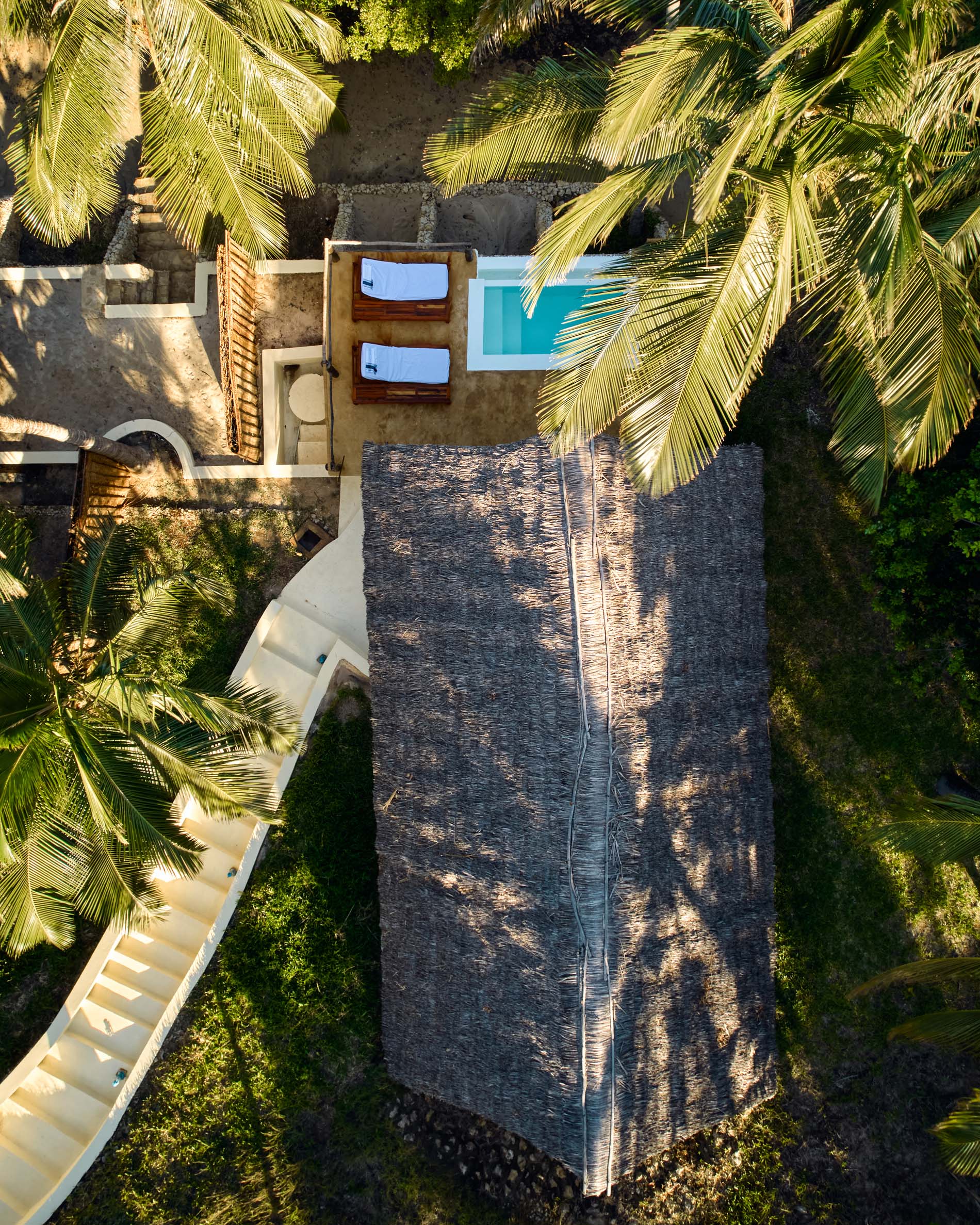 Unser Swimmingpool liegt abgeschieden im sonnigsten Teil von Pole Pole, umgeben von sanft wiegenden Palmen. Er besteht aus einer Reihe von Kreisen und ist von einem wunderschönen Deck aus lokalem Kokosnussholz umgeben. Sein Design erinnert an ein traditionelles arabisches Segelboot, wobei verwitterte Teile alter Segelboote in seine Gestaltung integriert wurden.