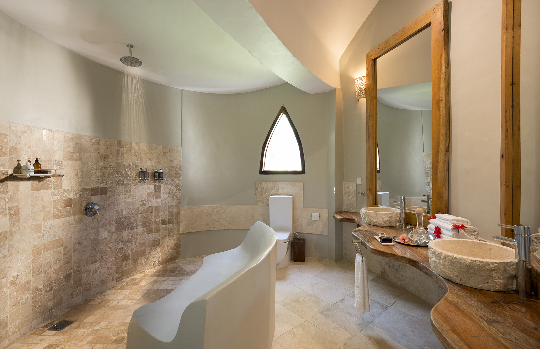 Jedes Hauptschlafzimmer im Stil eines Rundhauses ist mit einem Luxus-Badezimmer en-suite (mit Wasserfall-Dusche) ausgestattet, während die Wohnbereiche mit einer Xanadu-Kuppel mit übergroßem Ventilator und offenen Bogengängen im Pavillon-Stil ausgestattet sind.